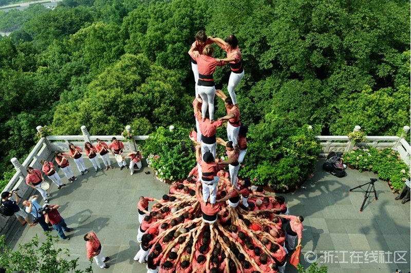 A total of 190 performers from Spain build human towers - 'Castells', a Catalan tradition originating in the 18th century, on July 2, 2015 in Hangzhou, east China. (Photo/ zjol.com.cn)