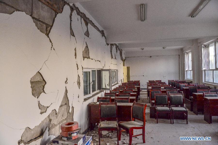 A governmental office building is damaged by an earthquake in Pixna Township of Pishan County of Hotan Prefecture, northwest China's Xinjiang Uygur Autonomous Region, July 4, 2015. A 6.5-magnitude earthquake rocked Pishan County of Hotan Prefecture at 9:07 a.m. (0107GMT), with the epicenter recorded at 37.6 degrees north and 78.2 degrees east, according to the China Earthquake Networks Center (CENC). Three people were killed and 71 others injured in the quake. Local government has erected 1,500 tents to accomodate residents affected by the earthquake. (Xinhua/Shen Qiao) |
