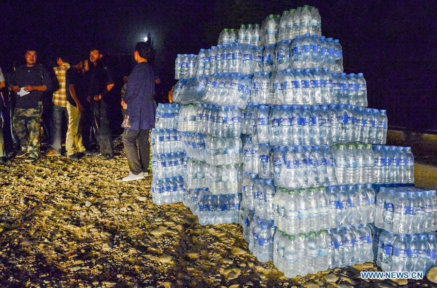 Relief materials are seen in Pixna Township of Pishan County of Hotan Prefecture, northwest China's Xinjiang Uygur Autonomous Region, July 4, 2015. A 6.5-magnitude earthquake rocked Pishan County of Hotan Prefecture at 9:07 a.m. (0107GMT), with the epicenter recorded at 37.6 degrees north and 78.2 degrees east, according to the China Earthquake Networks Center (CENC). Three people were killed and 71 others injured in the quake. Local government has erected 1,500 tents to accomodate residents affected by the earthquake. (Xinhua/Shen Qiao) |