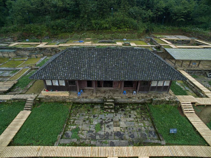 Photo taken on July 3, 2015 shows an aerial view of Hailongtun Fortress in southwest China's Guizhou Province. Tusi sites -- the remains of an ancient political system adopted by Chinese emperors to govern ethnic minority regions in south-central and southwest China -- were inscribed in the World Heritage List on Saturday. The inscribed sites, located in mountainous areas, are Laosicheng in Hunan Province, Tangya in Hubei Province and Hailongtun Fortress in Guizhou Province. Tusi literally means hereditary tribal headmen appointed by Chinese emperors to govern the often unruly ethnic minority regions in the central and western parts of south China, where the specific tribal governance system was adopted from the 13th to the early 20th century. (Xinhua/Liu Xu) |