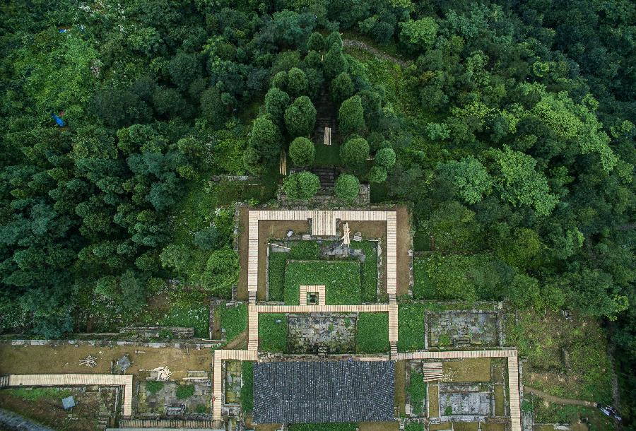 Photo taken on July 3, 2015 shows an aerial view of Hailongtun Fortress in southwest China's Guizhou Province. Tusi sites -- the remains of an ancient political system adopted by Chinese emperors to govern ethnic minority regions in south-central and southwest China -- were inscribed in the World Heritage List on Saturday. The inscribed sites, located in mountainous areas, are Laosicheng in Hunan Province, Tangya in Hubei Province and Hailongtun Fortress in Guizhou Province. Tusi literally means hereditary tribal headmen appointed by Chinese emperors to govern the often unruly ethnic minority regions in the central and western parts of south China, where the specific tribal governance system was adopted from the 13th to the early 20th century. (Xinhua/Liu Xu)