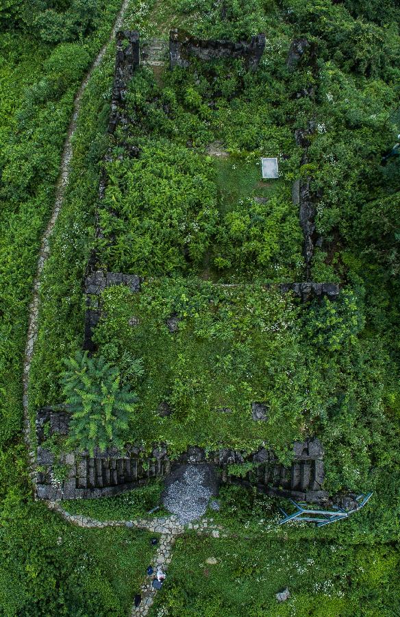 Photo taken on July 3, 2015 shows an aerial view of Hailongtun Fortress in southwest China's Guizhou Province. Tusi sites -- the remains of an ancient political system adopted by Chinese emperors to govern ethnic minority regions in south-central and southwest China -- were inscribed in the World Heritage List on Saturday. The inscribed sites, located in mountainous areas, are Laosicheng in Hunan Province, Tangya in Hubei Province and Hailongtun Fortress in Guizhou Province. Tusi literally means hereditary tribal headmen appointed by Chinese emperors to govern the often unruly ethnic minority regions in the central and western parts of south China, where the specific tribal governance system was adopted from the 13th to the early 20th century. (Xinhua/Liu Xu)