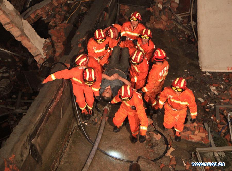 Rescuers carry an injured person at a collapsed factory building in Wenling, east China's Zhejiang Province, July 4, 2015. Nine people were still trapped in the rubble of a factory building that collapsed on Saturday afternoon in east China's Zhejiang Province. (Xinhua) |