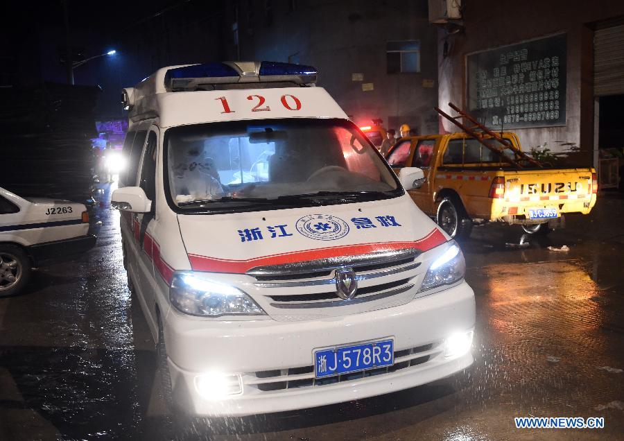 An ambulance stops at the accident site in Daxi Town of Wenling City, east China's Zhejiang Province, July 5, 2015. The Jieyu Shoe Factory in Daxi Town collapsed Saturday afternoon, leaving six people dead. (Xinhua/Han Chuanhao)