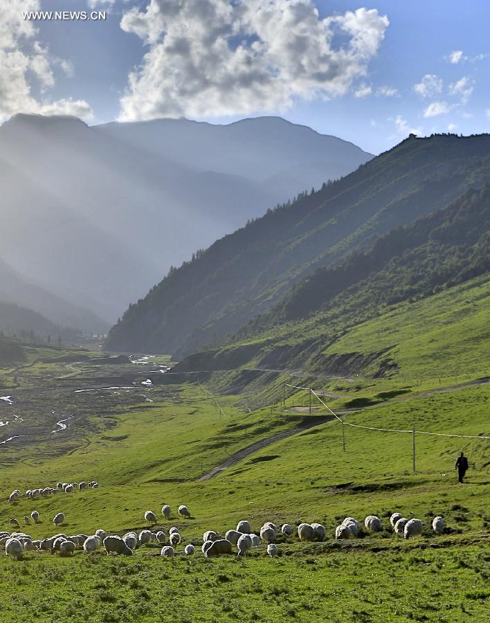 Flocks of sheep eat grass on the pasture in the Qilian Mountains in Wuwei, northwest China's Gansu Province, July 5, 2015. (Xinhua/Jiang Aiping)