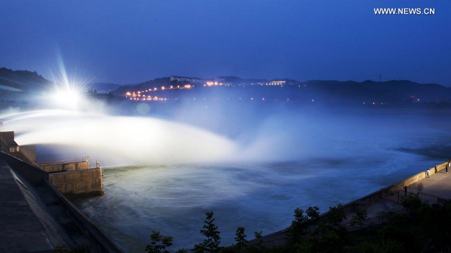 Tourists look at water cascades generated by the Xiaolangdi Dam on the Yellow River in Jiyuan, central China's Henan Province, July 5, 2015. The artificial water cascades generated by the Xiaolangdi Dam on the Yellow River are feasts for the eyes for tourists when the dam does its annual de-sedimentation between late June and early July. (Xinhua/Miao Qiunao)