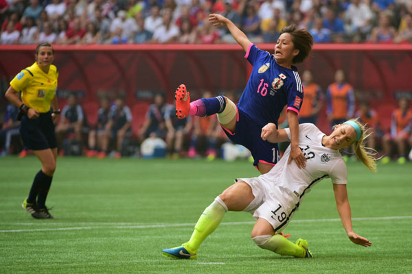 United States defender Julie Johnston (19) and Japan forward Mana Iwabuchi (16) get tangled up in the second half of the final of the FIFA 2015 Women's World Cup at BC Place Stadium. [Photo/Agencies]