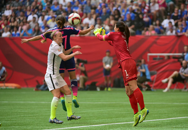 United States defender Becky Sauerbrunn (4) battles Japan forward Yuki Ogimi (17) as United States goalkeeper Hope Solo (1) moves to to assist in the second half of the final of the FIFA 2015 Women's World Cup at BC Place Stadium. [Photo/Agencies] |