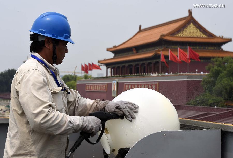 Workers clean and overhaul a lamp during the annual maintenance of city lamps near Tian'anmen Square, in Beijing, capital of China, July 6, 2015. (Xinhua/Gong Lei)