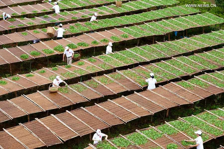Tea growers dry tea leaves at a white tea garden in Fuding, southeast China's Fujian Province, July 6, 2015. Almost 60 kilograms of tea leaves were dried during a fair here on Monday.(Xinhua/Jiang Kehong)