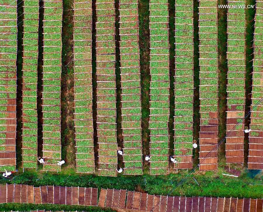 Tea growers dry tea leaves at a white tea garden in Fuding, southeast China's Fujian Province, July 6, 2015. Almost 60 kilograms of tea leaves were dried during a fair here on Monday.(Xinhua/Jiang Kehong)