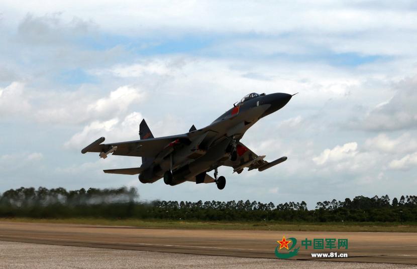 In this photo taken on June 25, J-11 fighters of the Air Force of Guangzhou Military Region under Chinese People's Liberation Army hold confrontation drill. (Photo source: 81.cn)