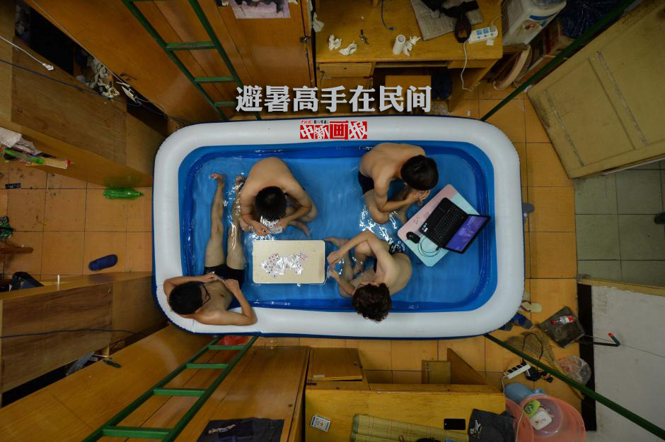A little swimming pool is put in the aisle of the student dormitory in a university in Wuhan, capital of central China's Hubei province. Some students played cards and surfed the internet in the swimming pool to enjoy the cool by sitting in water. (Photo/CNS)