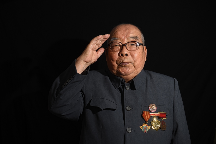 Hu Qing, 88, became a underground Party member when he was sixteen years old and disseminated information and kept a close watch on the enemy's movements. On occasion of the 70th anniversary of the victory of the War of Chinese People's Resistance against Japanese Aggression, a Xinhua reporter takes photos of nine veterans’ salutes in Chengde, north China’s Hebei province. (Photo/Xinhua) |