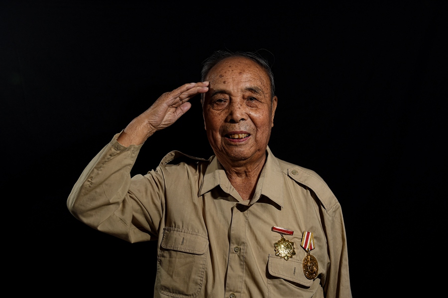 Li Zhenqi, 89, whose parents died when he was a little boy. He became a messenger for Chinese army at the age of 16 and joined in Chinese army officially in 1945. On occasion of the 70th anniversary of the victory of the War of Chinese People's Resistance against Japanese Aggression, a Xinhua reporter takes photos of nine veterans’ salutes in Chengde, north China’s Hebei province. (Photo/Xinhua) |