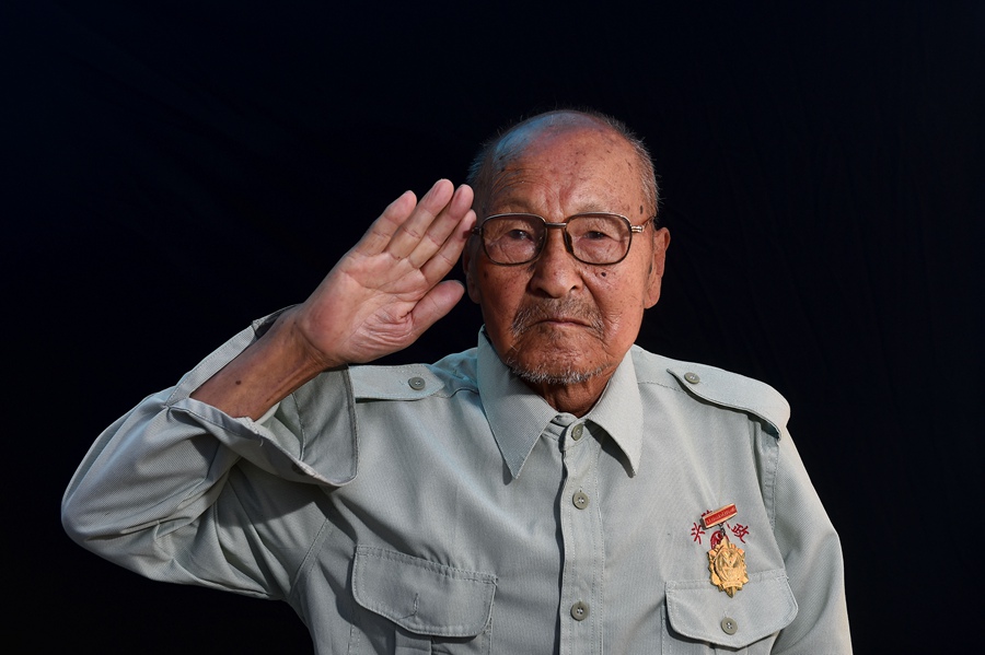 Jin Litang, 91, was captured by Japanese army in 1943. After he saw his three uncles killed by Japanese soldiers, he escaped and joined in the Chinese army. He fortunately survived from a gunshot at head.On occasion of the 70th anniversary of the victory of the War of Chinese People's Resistance against Japanese Aggression, a Xinhua reporter takes photos of nine veterans’ salutes in Chengde, north China’s Hebei province. (Photo/Xinhua) |