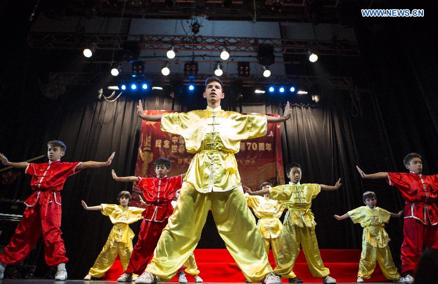 Members of the Argentine Wushu Club perform during the commemoration in Buenos Aires city, Argentina, July 6, 2015. Overseas Chinese in Argentina on Monday celebrated the 70th anniversary of the victory in the Chinese People's War of Resistance against Japanese Aggression and the victory of World's Anti-Fascist War. (Xinhua/Martin Zabala)