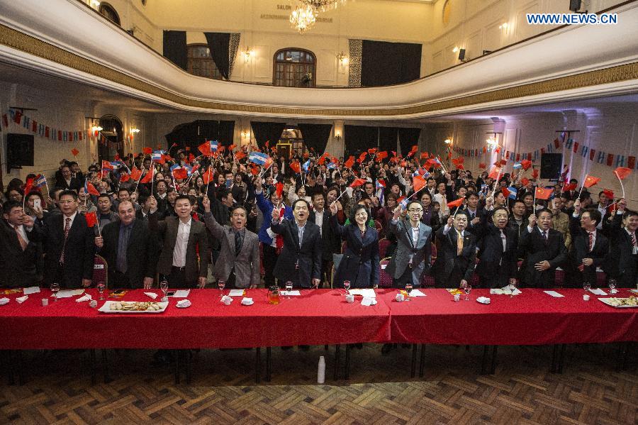 Chinese Ambassador to Argentina Yang Wanming (6th L, front) attends the commemoration in Buenos Aires city, Argentina, July 6, 2015. Overseas Chinese in Argentina on Monday celebrated the 70th anniversary of the victory in the Chinese People's War of Resistance against Japanese Aggression and the victory of World's Anti-Fascist War. (Xinhua/Martin Zabala) |