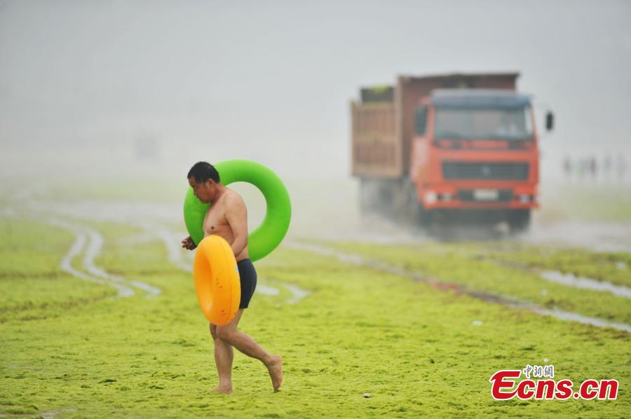 Forklifts and trucks are used to clear algae bloom piling on a beach in Qingdao city, East China’s Shandong province, July 6, 2015. The coastal city, a tourist destination in summer, is facing an invasion from algae bloom due to tides and winds. (Photo: China News Service/Wang Haibin)