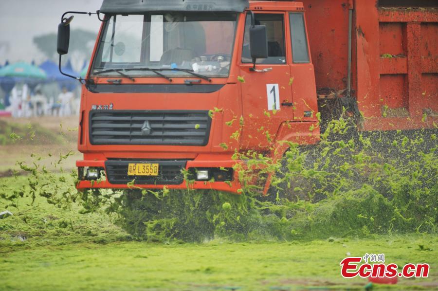 Forklifts and trucks are used to clear algae bloom piling on a beach in Qingdao city, East China’s Shandong province, July 6, 2015. The coastal city, a tourist destination in summer, is facing an invasion from algae bloom due to tides and winds. (Photo: China News Service/Wang Haibin) |