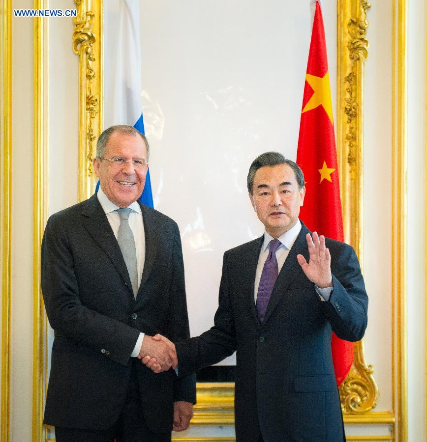 Chinese Foreign Minister Wang Yi (R) meets with Russian Foreign Minister Sergei Lavrov at the Palais Coburg Hotel where the Iran nuclear talks are being held, in Vienna, Austria on July 6, 2015. (Xinhua/Qian Yi)