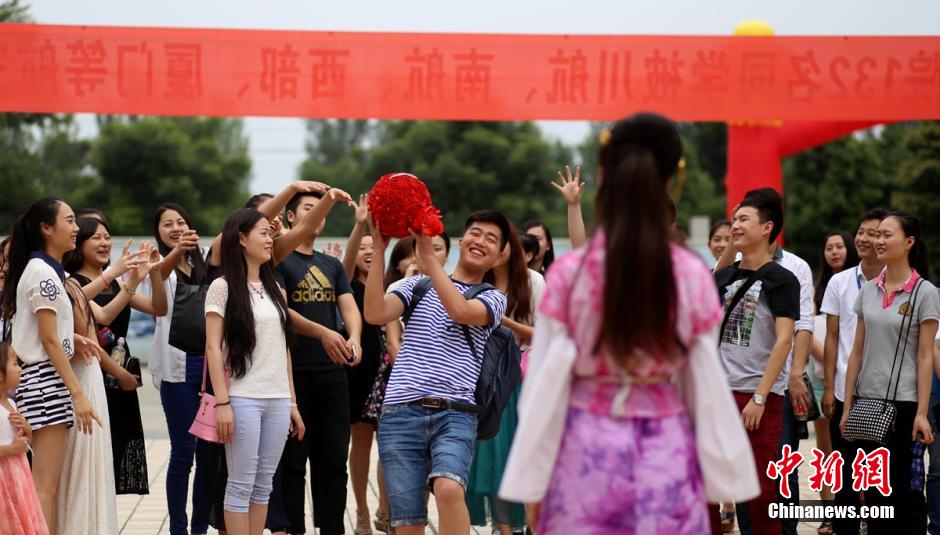 6 students majoring flight attendance holds a talent competition on campus to find their true love in southwest China's Chengdu on July 6, 2014. The six girls competed talents such as art martial, tea ceremony with the challengers. "We hold the competition to meet more friends, and to find a soul mate," said one of them. (Photo/Liu Zhongjun)