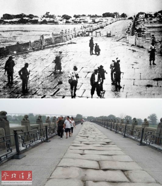 Above: The Lugou Bridge occupied by Japanese army. (File photo) Below: Visitors walk on the Lugou Bridge on June 28, 2015. (Imposition photo) (Xinhua/Li Xin)