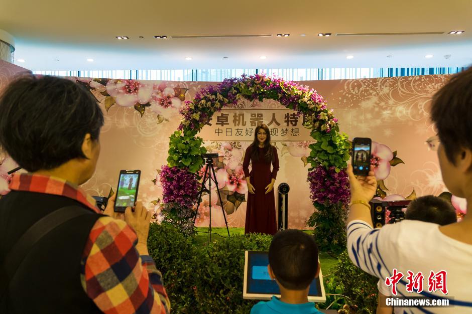 "Yang Yang", a humanoid robot with a variety of realistic expressions, appears in Shanghai on July 7, 2015. Yang, with smooth and delicate human-like skin, can"talk, shake hands and sing. She made debuts at the World Internet Conference in Beijing in May.(CNS Photo) |