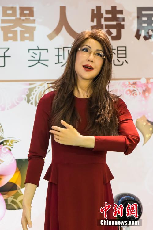 "Yang Yang", a humanoid robot with a variety of realistic expressions, appears in Shanghai on July 7, 2015. Yang, with smooth and delicate human-like skin, can"talk, shake hands and sing. She made debuts at the World Internet Conference in Beijing in May.(CNS Photo)