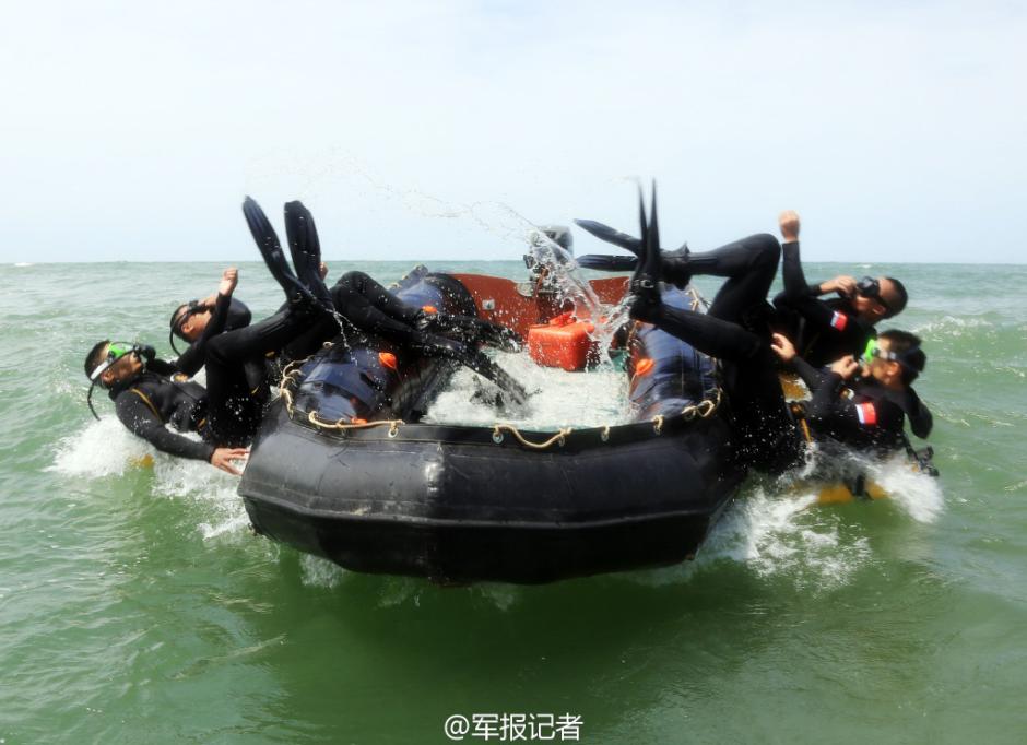 Photos taken on July 7, 2015 show combat training of oceanic diving conducted off the coast of south China's Guangdong province. (Source: Weibo of PLA Daily)