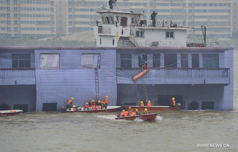 A water rescue drill is held on the Ganjiang River in Nanchang, capital of east China's Jiangxi Province, July 8, 2015. Some 300 people and 33 vessels as well as drones and rescue vehicles were involved in the drill here on Wednesday. (Xinhua/Zhou Mi)