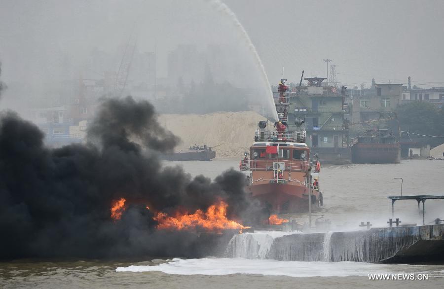 A water rescue drill is held on the Ganjiang River in Nanchang, capital of east China's Jiangxi Province, July 8, 2015. Some 300 people and 33 vessels as well as drones and rescue vehicles were involved in the drill here on Wednesday. (Xinhua/Zhou Mi)