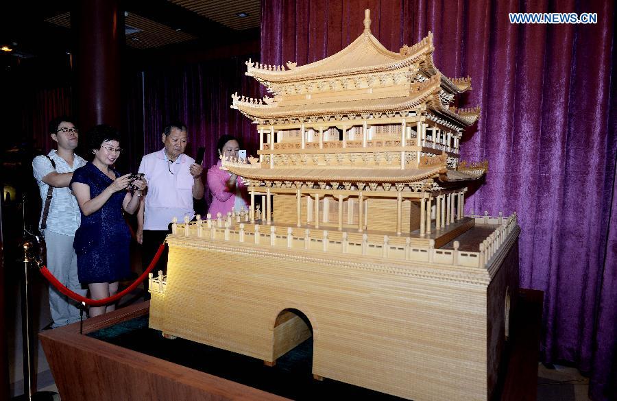 Visitors look at a wooden miniature building of Xi'an's Bell Tower at an exhibition featuring ancient Chinese architecture in Xi'an, northwest China's Shaanxi Province, July 8, 2015. (Xinhua/Liu Xiao)