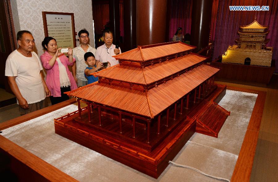 Visitors look at a wooden miniature building of Xi'an's Bell Tower at an exhibition featuring ancient Chinese architecture in Xi'an, northwest China's Shaanxi Province, July 8, 2015. (Xinhua/Liu Xiao)