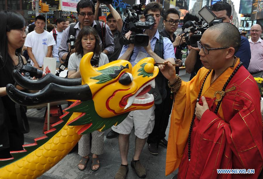 A monk dots the eyes for a dragon during the dragon boat awakening ceremony at Times Square in New York, the United States on July 7, 2015. A dragon boat awakening ceremony is held at Times Square for 25th anniversary Hong Kong dragon boat festival here on Monday. The 25th annual Hong Kong Dragon Boat Festival in New York will be held on Aug. 8 and Aug. 9. (Xinhua/Wang Lei) |