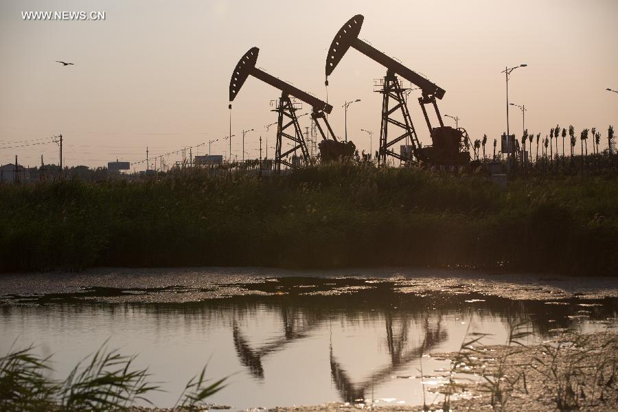 Photo taken on July 7, 2015 shows oil pumps at dusk in Daqing, northeast China's Heilongjiang Province. Daqing oilfield was discovered in 1959, which is the largest inland oilfield in China. On the 4,300 square kilometers oilfield, there are some 50,000 oil wells. (Xinhua/Jin Liwang)