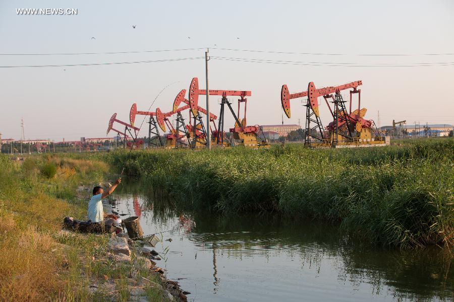 A man fishes near oil pumps in Daqing, northeast China's Heilongjiang Province, July 7, 2015. Daqing oilfield was discovered in 1959, which is the largest inland oilfield in China. On the 4,300 square kilometers oilfield, there are some 50,000 oil wells. (Xinhua/Jin Liwang) |