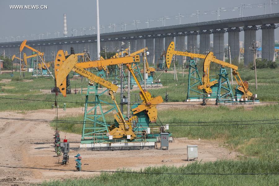 Photo taken on July 8, 2015 shows oil pumps in Daqing, northeast China's Heilongjiang Province. Daqing oilfield was discovered in 1959, which is the largest inland oilfield in China. On the 4,300 square kilometers oilfield, there are some 50,000 oil wells. (Xinhua/Jin Liwang) |