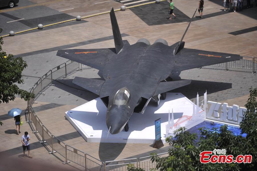 A replica of China’s J-20 stealth fighter is on display in a square in Southwest China’s Chongqing municipality, July 8, 2015. The life size alloy model is 4.5 meters tall, 21.26 meters long, and has a wingspan of 12.88 meters. (Photo: China News Service/Chen Chao)