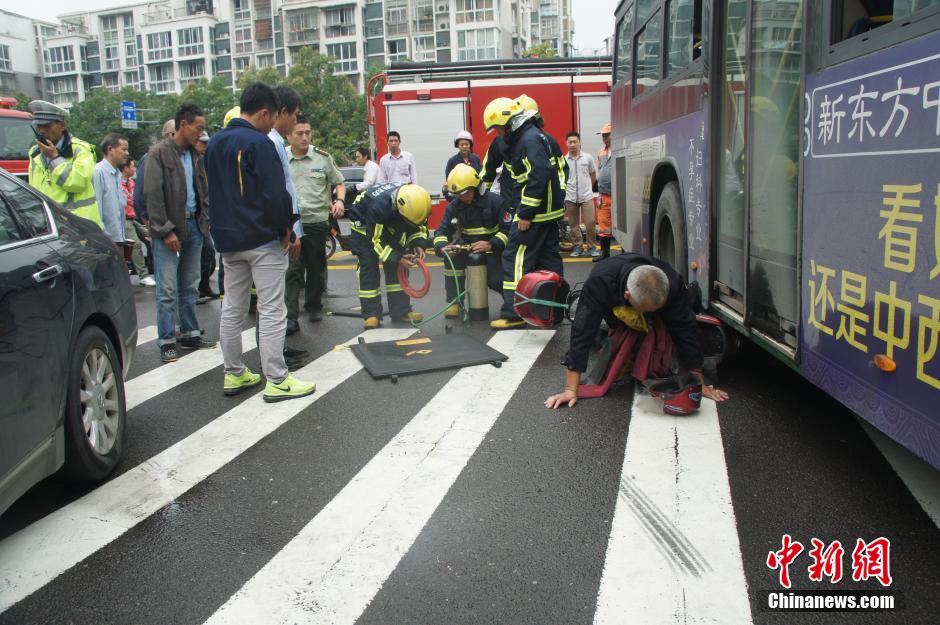 An old man and his motorcycle were pinned under a bus after a collision in Ningbo, eastern China's Zhejiang province on July 8. The old man was saved by the fire fighters after the passersby lifted the vehicle up. (CNS Photo)