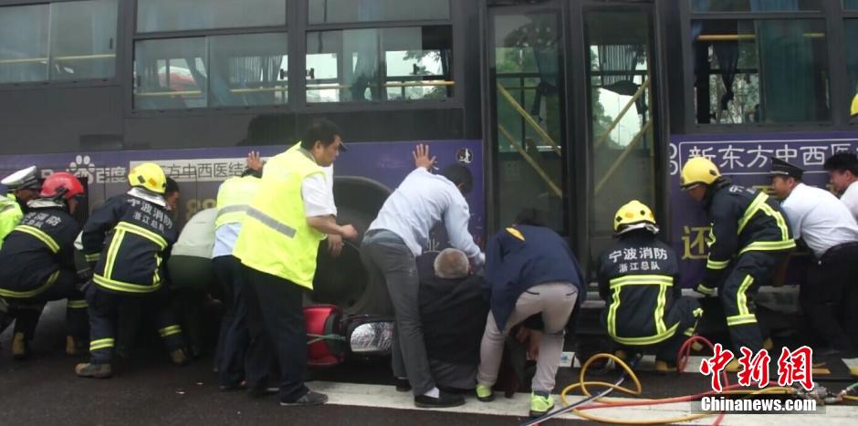 An old man and his motorcycle were pinned under a bus after a collision in Ningbo, eastern China's Zhejiang province on July 8. The old man was saved by the fire fighters after the passersby lifted the vehicle up. (CNS Photo)