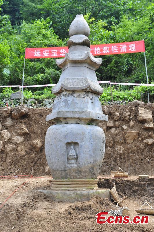 A relic of the Ming Dynasty (1368-1644) is found at a village in Yuan’an county, Central China’s Hubei province, July 10, 2015. A stone tortoise was found first when construction work was taking place, and archeological workers later discovered a Buddhist pagoda. (Photo: China News Service/Wang Kangming) |