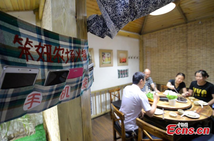 The mobile phones of customers are put inside bags at a hot pot restaurant in Handan city, North China’s Hebei province. The restaurant manager says the measure aims to remind customers to focus on food and their friends or family members while eating at the establishment, instead of staring at their phones. (Photo: China News Service/Hao Qunying)