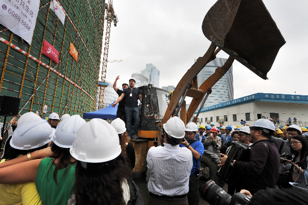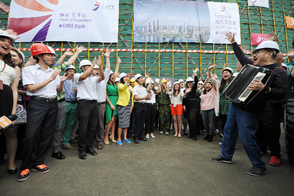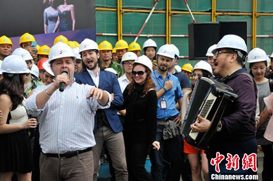 40 international singers from 12 countries come to a construction site in Suzhou, east China's Jiangsu province on July 8, 2015. They sang several songs together with over 600 workers in the site. (Photo/CNS and China Daily)