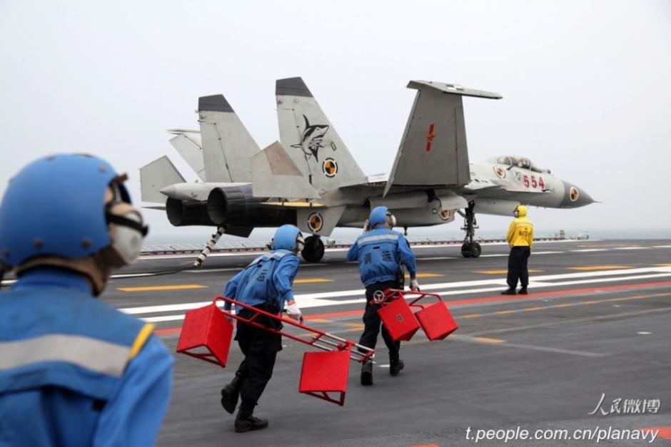The official micro blog of Chinese PLA navy releases a group of photos showing China's aircraft carrier Liaoning in training, July 8, 2015. The ship-borne J-15 fighters conducted take-off and landing training on the ship. (Photo/t.people.com.cn/planavy)