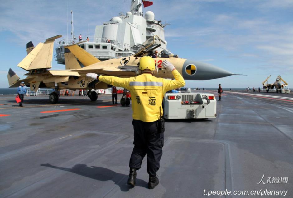 The official micro blog of Chinese PLA navy releases a group of photos showing China's aircraft carrier Liaoning in training, July 8, 2015. The ship-borne J-15 fighters conducted take-off and landing training on the ship. (Photo/t.people.com.cn/planavy) |