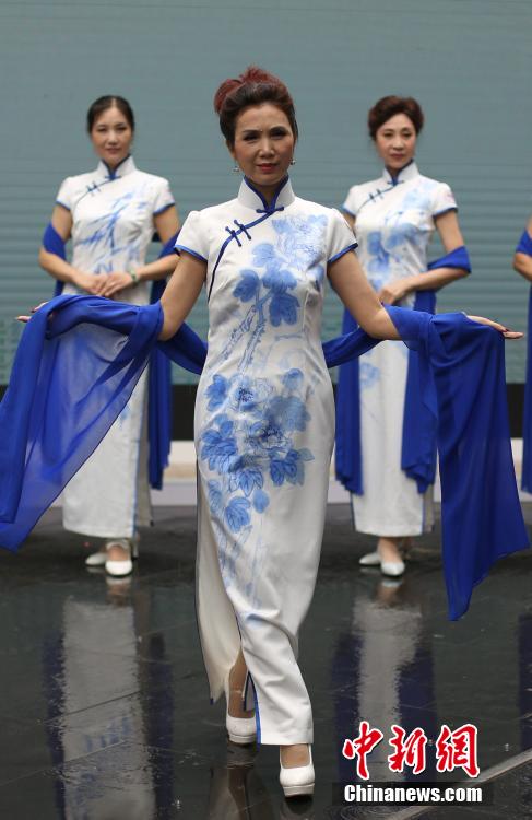 A model team composed of middle-aged women in cheongsams performs