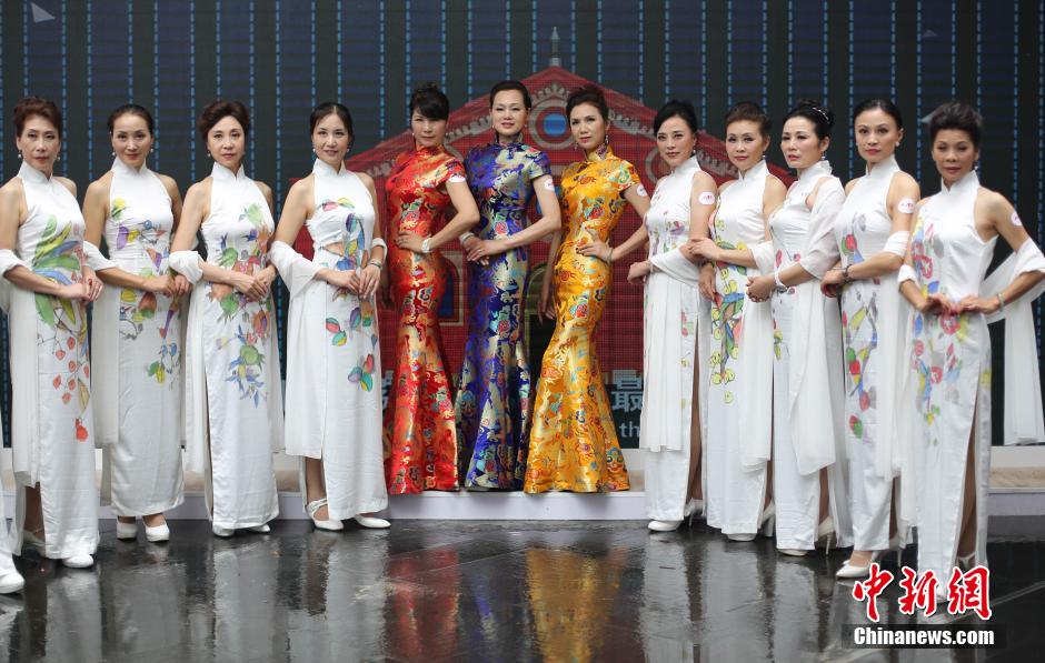 A model team composed of middle-aged women in cheongsams performs in the show with the theme of “Nanjing Week at the Expo Milano”