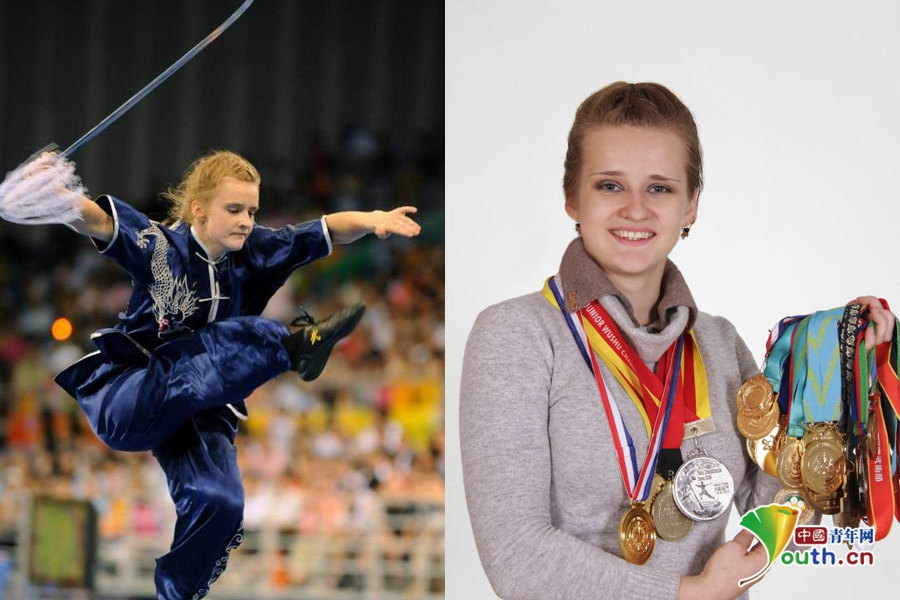 Renia does daily exercises in the Wushu hall. (youth.cn/Guo Wenjing)