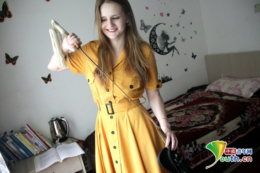 Renia shows her beloved sword to the reporter. (youth.cn/Guo Wenjing)